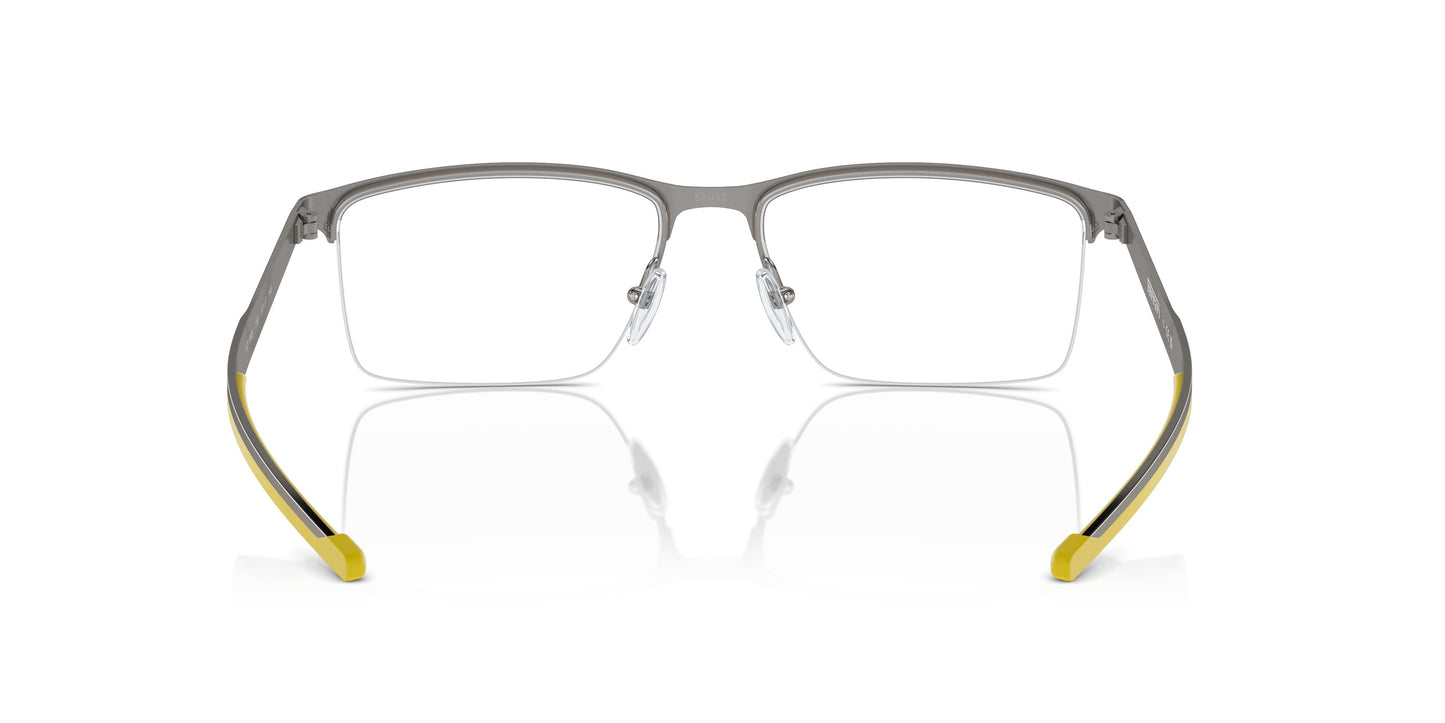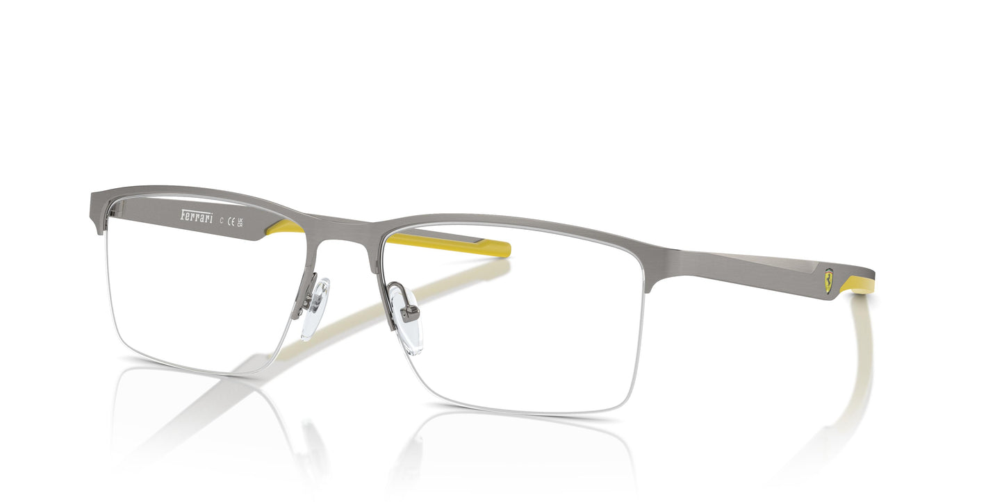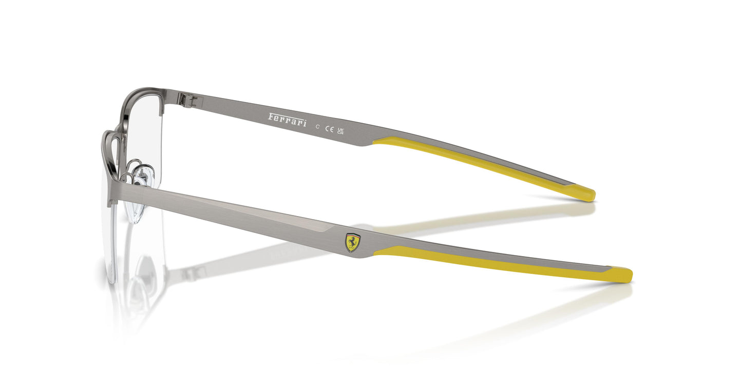 Les lignes de ce modèle demi-cerclé expriment la vitesse et l'esprit Ferrari. Cette monture rectangulaire en métal est dotée de branches fines, dont l'embout en caoutchouc arbore la palette distinctive et le logo Scuderia Ferrari. Grâce à sa structure métallique, cette monture demi-cerclée est un classique intemporel. Les branches fines en métal évoquent l'héritage de la course automobile, avec leur embout en caoutchouc contrastant et le logo Scuderia Ferrari.