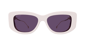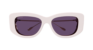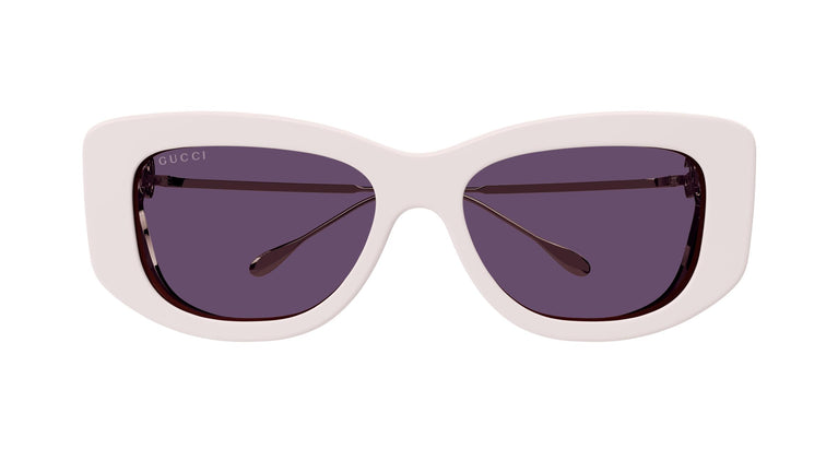 Lunettes en acétate et métal avec une face épaisse et plate en acétate, ornée d'une monture métallique enveloppante, pour un mélange innovant de technologie et de féminité. Un design œil-de-chat aux lignes douces. Le logo GG est gravé sur les branches métalliques. Une palette de couleurs féminines et commerciales associée à des verres unis.