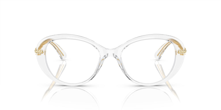 Ce modèle de vue de droite est rond, avec une face ovale en acétate et des tiges métalliques en forme de tubes, est un pari sur les volumes ronds. Les tiges apparaissent sur deux niveaux, avec la partie supérieure connectée à l'avant et ornée de cristaux pavé. Les tiges en acétate de la même couleur que l'avant offrent un plus grand confort et abritent le logo subtil. Impressionnante tige ronde avec sertissage de cristal pavé près de l'avant, montrant la précision de Swarovski dans la taille du cristal.