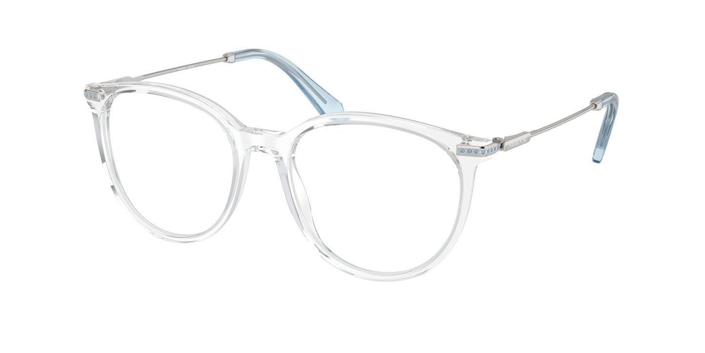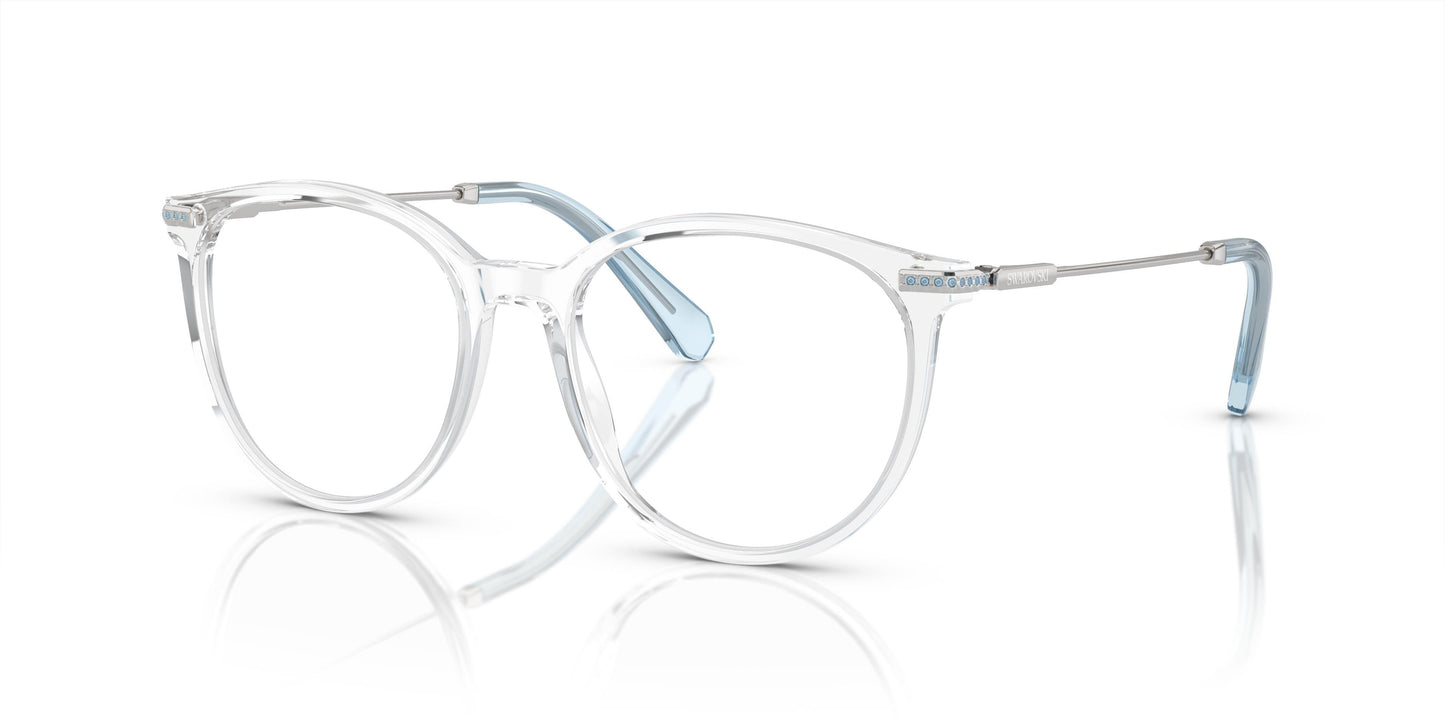 Pas besoin de choisir entre le métal ou l'acétate avec ce modèle de lunettes, car Swarovski offre l'équilibre parfait. La monture s'associe à des branches métalliques délicates, portant des cristaux transparents en silver night ou en aigue-marine pour apporter une brillance subtile. L'option d'acétate transparent avec du métal argent, embouts de branches bleu clair et cristaux aigue-marine se distingue dans la riche palette de couleurs. Modèle de lunettes en acétate avec monture polyvalente, huit cristaux Swarovski et un élégant logo métallique de la marque sur chaque branche métallique.