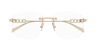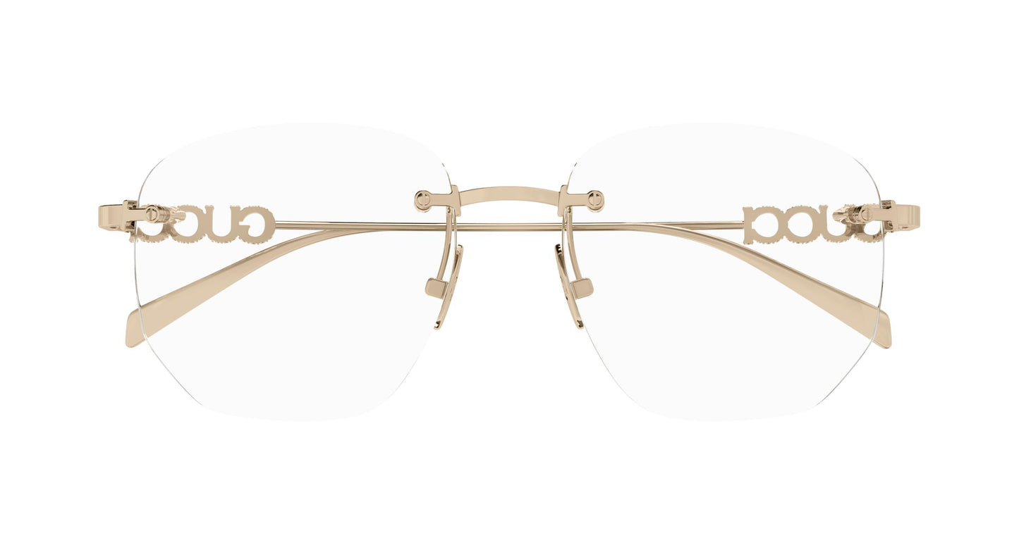 Modèles métalliques ornés du logo Gucci tridimensionnel sur les branches. Design carré. Logo Gucci tridimensionnel sur les branches. Palette de couleurs féminine, commerciale et contemporaine.