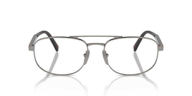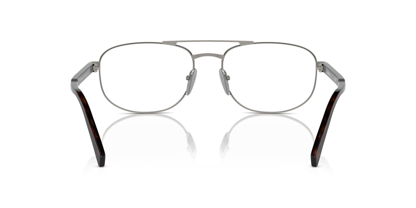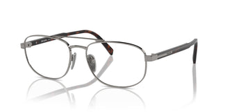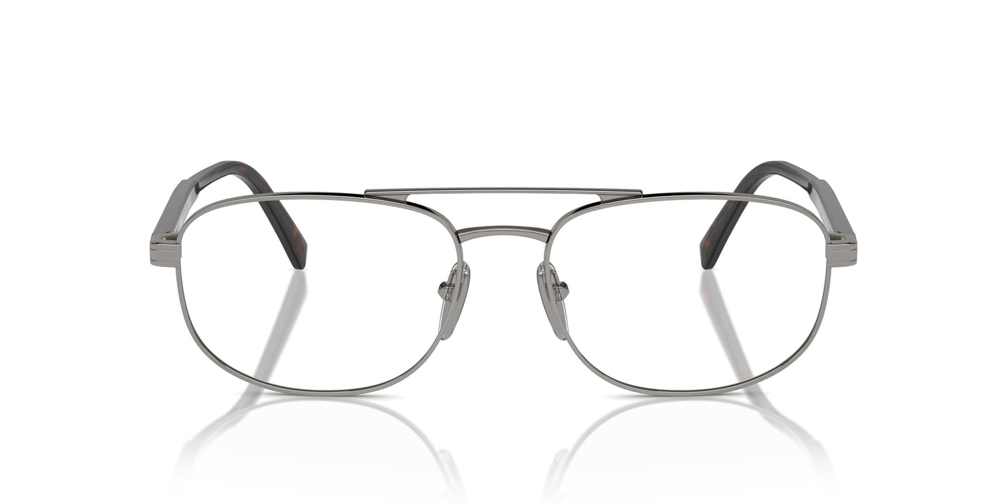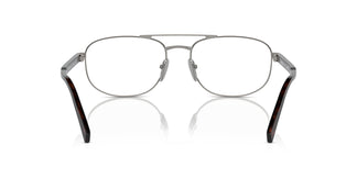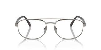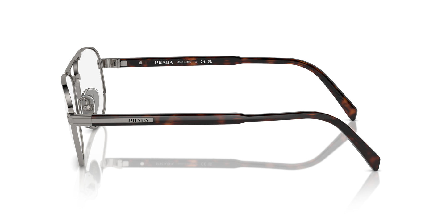 Prada combineert metaal en acetaat en kiest voor een verfijnd logo op de veren van dit pilotenmodel. Het logo staat op elegante metalen plaatjes die passen bij de kleur van het montuur en contrasteren met de verfijnde acetaatbasis. Het metalen pilotenmontuur met acetaatveren is voorzien van een metalen plaatje met het Prada-logo. Er zijn twee zilverkleurige opties met zwarte of transparante veren in grijs en bruin, een in goud met havannaoranje en een in grijs met donker havannabruin.