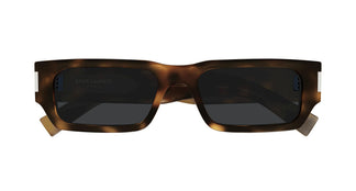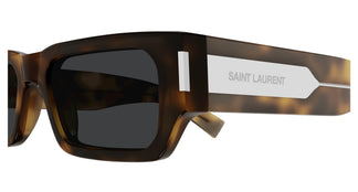 Een smal, uitgesproken rechthoekig ontwerp in de innovatieve highlight-lijn van het seizoen, Naked Wirecore, toont een sterk Saint Laurent-karakter. De stijl wordt versterkt door de grootste "hoek" ooit, 1 cm, met een metalen montuur. De dikke acetaatveren zijn gemaakt van een innovatief nieuw materiaal dat zorgt voor een zichtbaar montuur met een lasergegraveerd Saint Laurent-logo in een hoogglansafwerking. Het kleurenpalet omvat de iconische kristalreliëfkleuren van het seizoen en transparante kleuren.