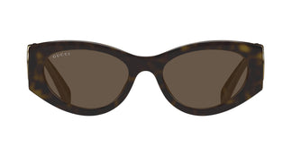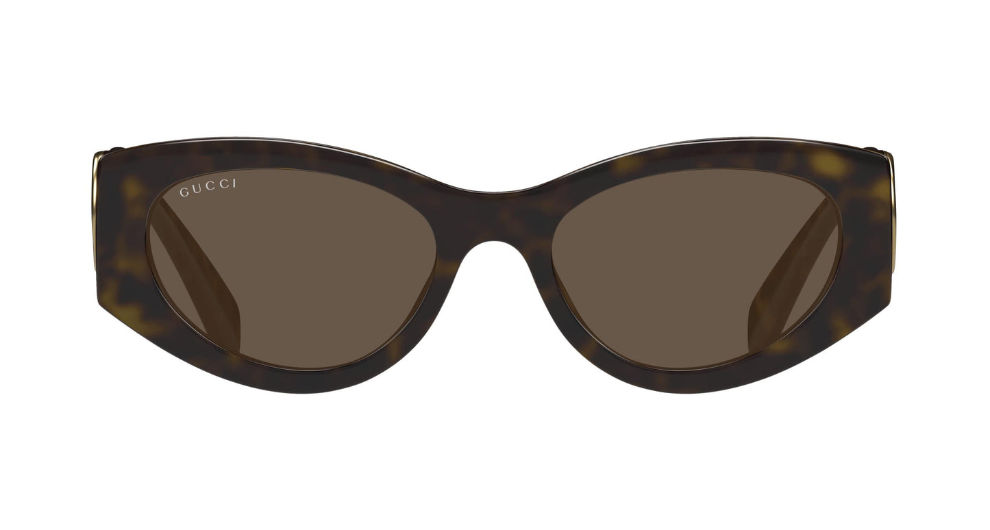 Vrouwelijke rechthoekige zonnebril van kunststof met een uniek uitgesneden logo op de pootjes, geaccentueerd door een metalen plaatje. Het logo is versierd met een metalen plaatje. Een levendig kleurenpalet.