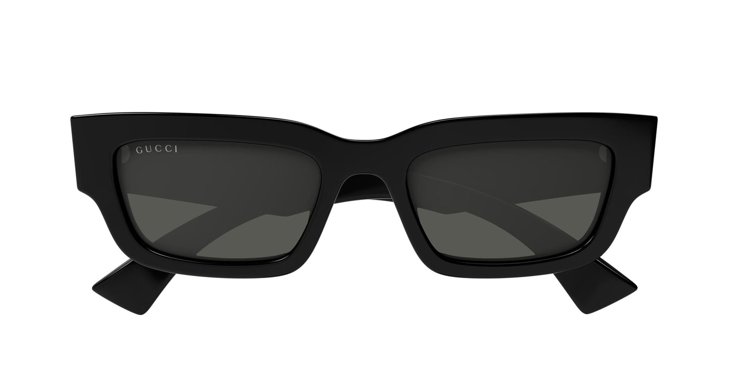 Acetaatmodellen met felle kleuren en een pantotheense hoek. Rechthoekige Wayfarers. Driedimensionaal Gucci-logo op de veren. Vrolijk kleurenpalet.