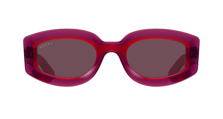 Blank, fargerik plast med synlig spoiler. Mandelformet. Preget Gucci-bokstaver på stengene. En popfargepalett forsterket av kontrastfarger som fremhever det unike ved rammene.
