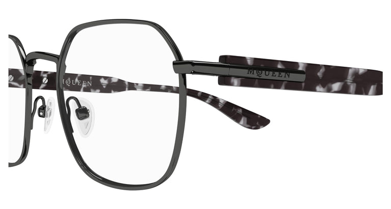 La «Cross-Bar», un elemento utilizado originalmente en la colección otoño-invierno 1995 Highland Rape, se ha renovado e introducido como nueva firma de la Casa, marcando el inicio de un nuevo capítulo. La nueva e icónica Cross-Bar integra la bisagra y dibuja la unión entre el frontal y las varillas en acetato integral. Un diseño pantos para hombre fácil de llevar y atemporal. El nuevo logotipo de McQueen está grabado a láser en la Cross-Bar metálica.