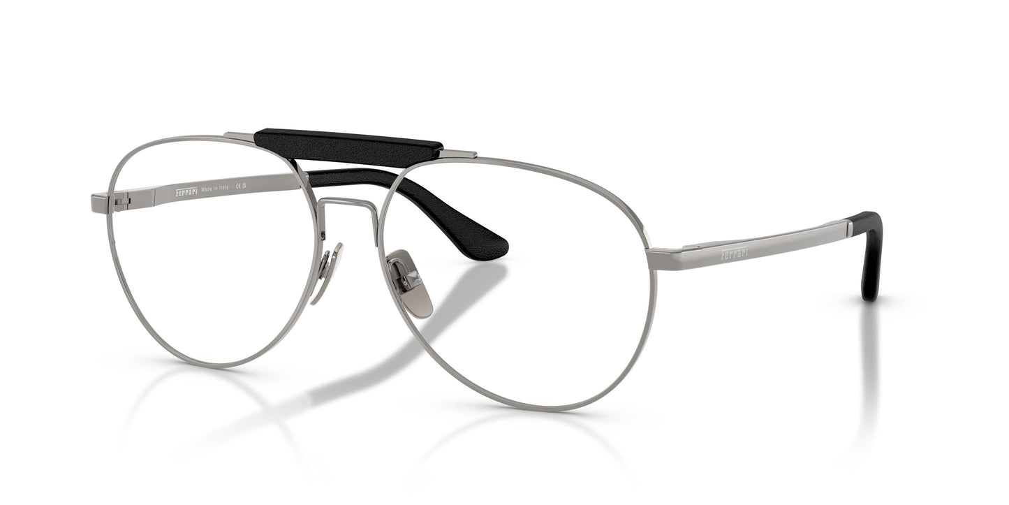Mínimos detalles en metal y lujosa piel definen este estilo óptico. Desde el contraste de texturas hasta el sutil logotipo grabado con láser, estas monturas reflejan la reconocida atención al detalle de ferrari. Una interpretación sofisticada de una forma clásica de gafas en bronce de cañón brillante u oro brillante. Monturas metálicas con forma de piloto en bronce de cañón u oro con una barra de cuero personalizada en negro o marrón. Elegantes patillas acabadas con el icónico logotipo ferrari y terminales de cuero personalizados.