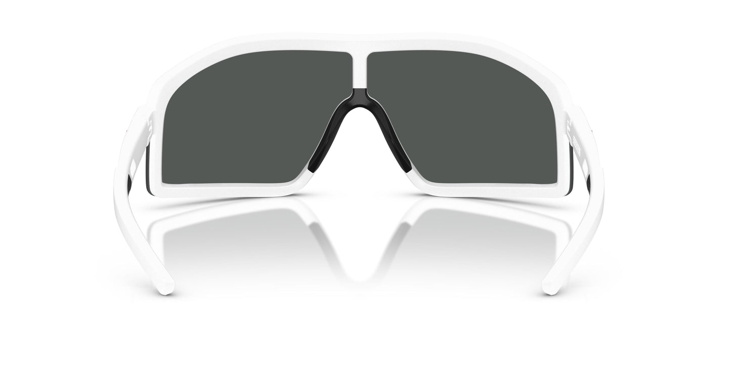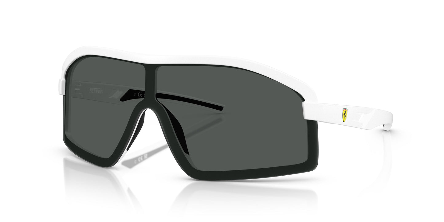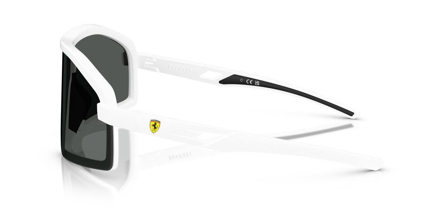 Una construcción de máscara que muestra una atrevida mezcla de formas enérgicas y materiales ligeros. La barra superior inyectada se une a las patillas del mismo color, creando un estilo deportivo con un toque de coche de carreras. El escudo de la Scuderia Ferrari completa el look, haciendo un guiño inconfundible al mundo de la F1. Monturas ligeras y futuristas en negro, blanco o rojo Ferrari, todas con acabado mate. Patillas inyectadas con terminales de goma inspirados en los coches de carreras.