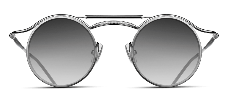 Una impactante creación redonda con fuertes líneas arquitectónicas que evoca un aire industrial. Los detalles acanalados, las viseras y una elegante barra superior lacada evocan la era de las máquinas de principios del siglo xx. Construcción ligera de titanio lacado aplicado a mano acabado en metal precioso hecho en japón