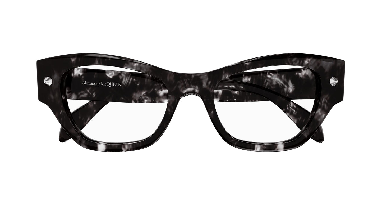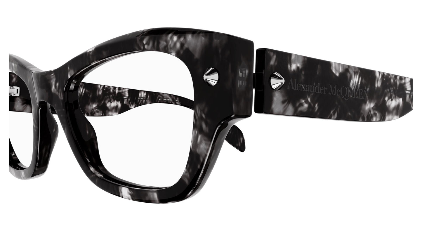 Os tachas, um detalhe emblemático e reconhecível, são um elemento-chave da assinatura McQueen, representando uma verdadeira expressão de rebeldia no coração do espírito McQueen. Um modelo "olho de gato" com silhueta feminina e linhas suaves, confeccionado em acetato espesso e adornado com icônicas tachas pontiagudas, totalmente integrado como um elemento funcional da estrutura da dobradiça. O logotipo Alexander McQueen é gravado a laser nas hastes. A paleta de cores inclui uma animação em tons comerciais.