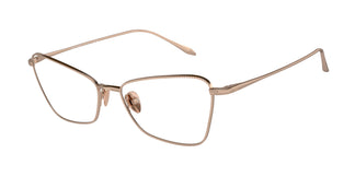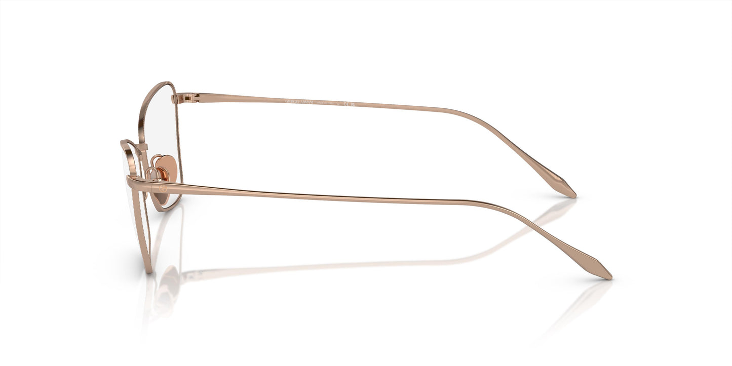 Armações contemporâneas e distintas inspiradas nas joias Giorgio Armani. Uma silhueta feminina com um toque moderno e um perfil geométrico e clean. Aro sofisticado com decoração inspirada em joias em três lados da armação. Nova haste fina de metal adornada com o logotipo do medalhão Giorgio Armani.