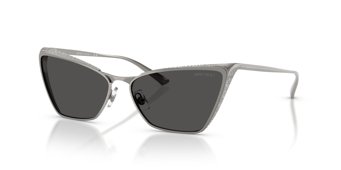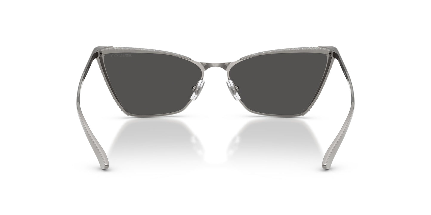 Este llamativo ojo de gato fusiona el estilo vanguardista con la artesanía italiana tradicional. Los cristales amplifican los ángulos penetrantes, mientras que los detalles personalizados añaden un elemento de exclusividad. Una lluvia de cristales plateados o transparentes en el alerón transforma estas elegantes monturas metálicas en unas gafas de lujo. Las refinadas patillas están acabadas con la firma Jimmy Choo grabada a láser y un emblema JC en cada punta interior.