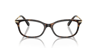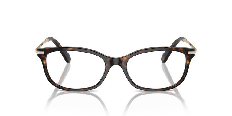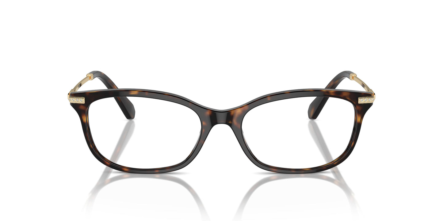 À primeira vista, parece uma discreta armação retangular de acetato, mas as hastes são tudo menos simples. Óculos de grau com o toque brilhante pelo qual a marca é tão conhecida, inspirados nos engastes de cristal pavé da Swarovski. As hastes engastadas com jogos de cristais pavé têm uma placa brilhante com o logotipo da Swarovski gravado e terminais de acetato. A armação retangular de acetato é apresentada em uma gama de elegantes cores que inclui opções em preto, havana escuro e transparente.