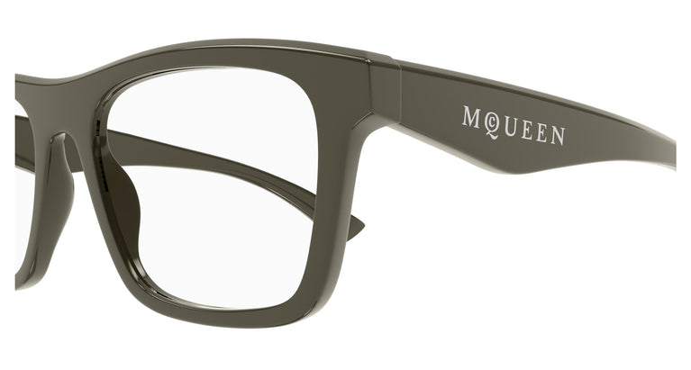 Prima reprezentare a noului logo McQueen într-o versiune de acetat. Bara de sus este decorată cu teșituri 3D care conferă modelelor o notă specială de rafinament. Forma dreptunghiulară masculină și modernă se caracterizează prin forma geometrică ascuțită a templelor. Noul logo McQueen este aplicat pe tâmple cu un adeziv metalic.