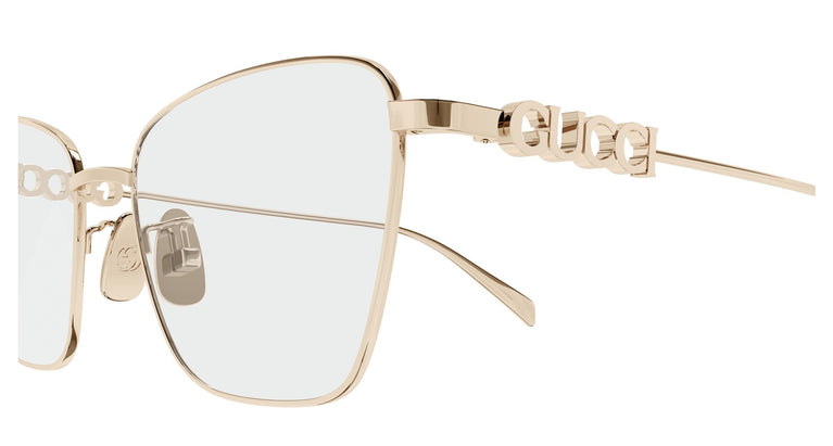 Modele metalice cu logo Gucci tridimensional pe tâmple. Design pătrat ochi de pisică. Logo-ul tridimensional Gucci pe tâmple. Paletă de culori feminină, comercială și contemporană.