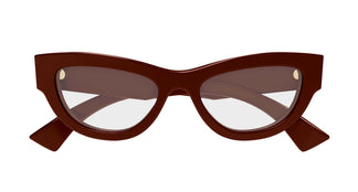 Modele din acetat cu culori intense, linii îndrăznețe și un unghi pantotenic. Design îndrăzneț cu ochi de pisică. Logo Gucci tridimensional pe tâmple. O paletă de culori feminină, comercială și contemporană, cu accente de strass.