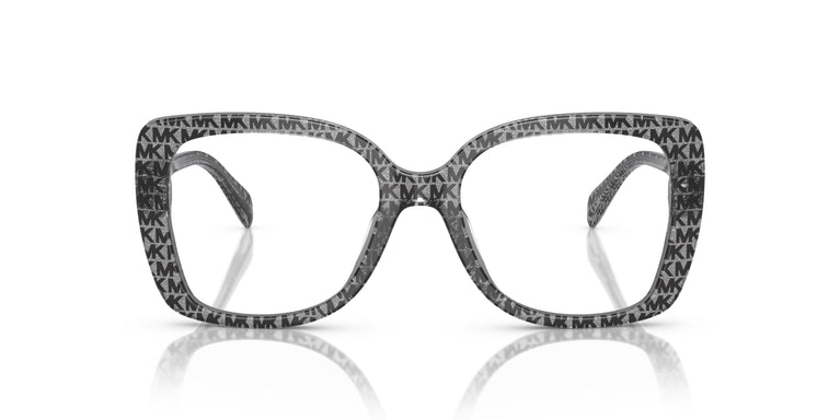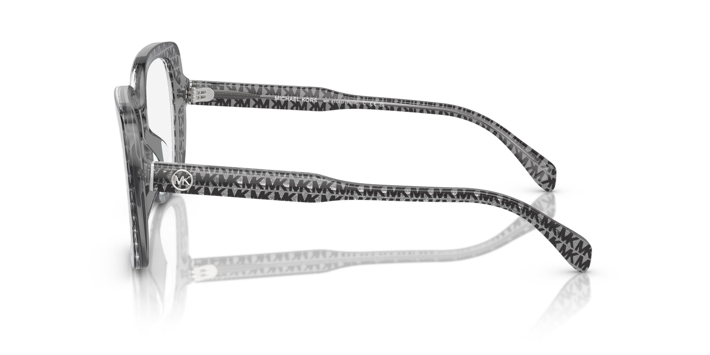 Rame moderne și accesorii îndrăznețe cu acetați atemporale Michael Kors. Acest stil optic supradimensionat combină un simbol îndrăzneț cu un cadru la modă. Prezintă o imprimare cu logo MK care se repetă asociat cu lentile gradiente și un logo circular MK cu farmec pe tâmple.