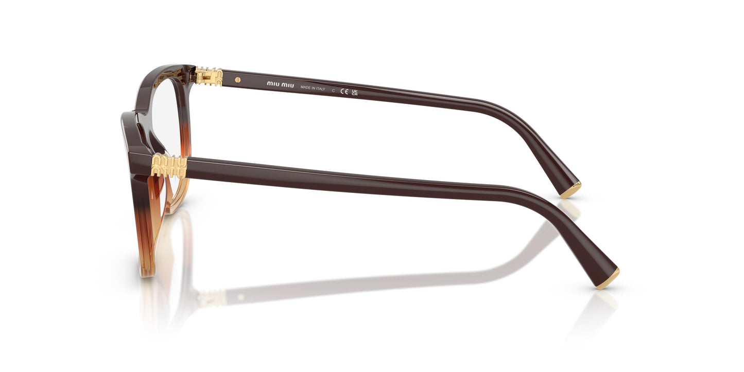 Reflectând amestecul iconic de jucăuș și rafinament al lui Miu Miu, acest design optic pătrat se remarcă prin volumele sale elegante și noile combinații de culori gradiente. Rama din acetat este completată de un logo metalic vertical elegant care face parte din structura balamalei. Acest design, disponibil și într-o versiune full-frame, prezintă temple subțiri din acetat care prezintă un logo vertical Miu Miu din metal integrat în structura balamalei. Un model optic pătrat disponibil într-o gamă bogată de culori din acetat, inclusiv două opțiuni noi de gradient în maro sau visiniu, precum și două opțiuni transparente.