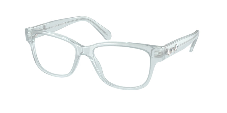 Swarovski, care nu renunță niciodată la strălucire, accentuează o ramă de acetat rectangulară versatilă cu cristale tăiate meticulos pe tijele ochelarilor. Cristalele transparente plasate la unghiuri unice sunt fixate în metal pentru a ieși în evidență mai mult, o tehnică inspirată de bijuteriile dextre. Culorile opaline vesele în roz sau albastru deschis accentuează o paletă de culori care, altfel, ar fi clasică: negru și două havane. Pe tije apar trei tăieturi de cristal diferite, acoperite cu metal, care creează o finisare elegantă și inconfundabilă Swarovski.